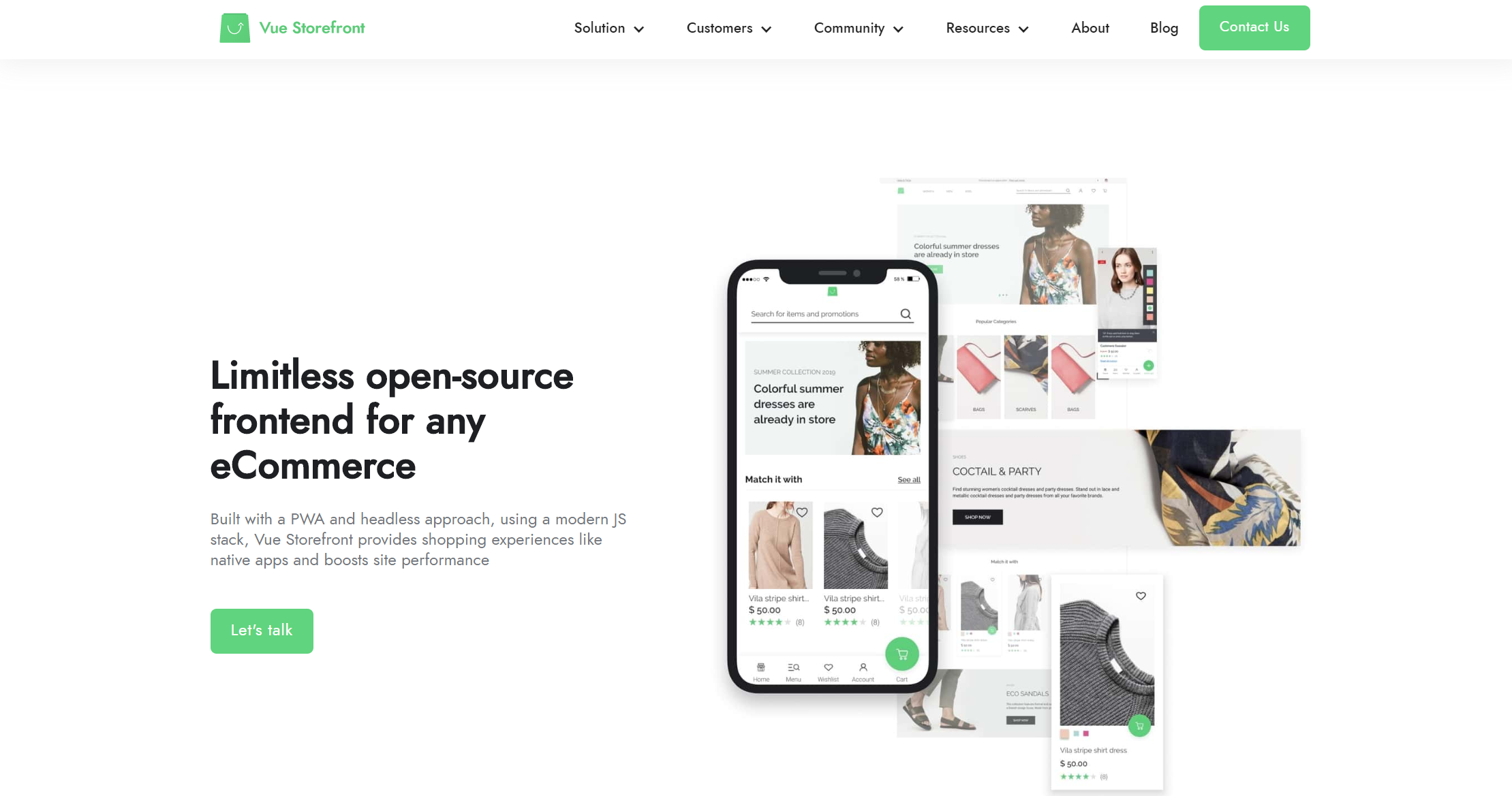 Thanks to their Storefront based on Vue.js you can create fantastic mobile-first stores that are fully customizable. Every component has a set of slots that you can customize and replace with your own material - images, icons, custom HTML markup, you name it! The Storefront UI is compatible with Google UX Playbook for retail.